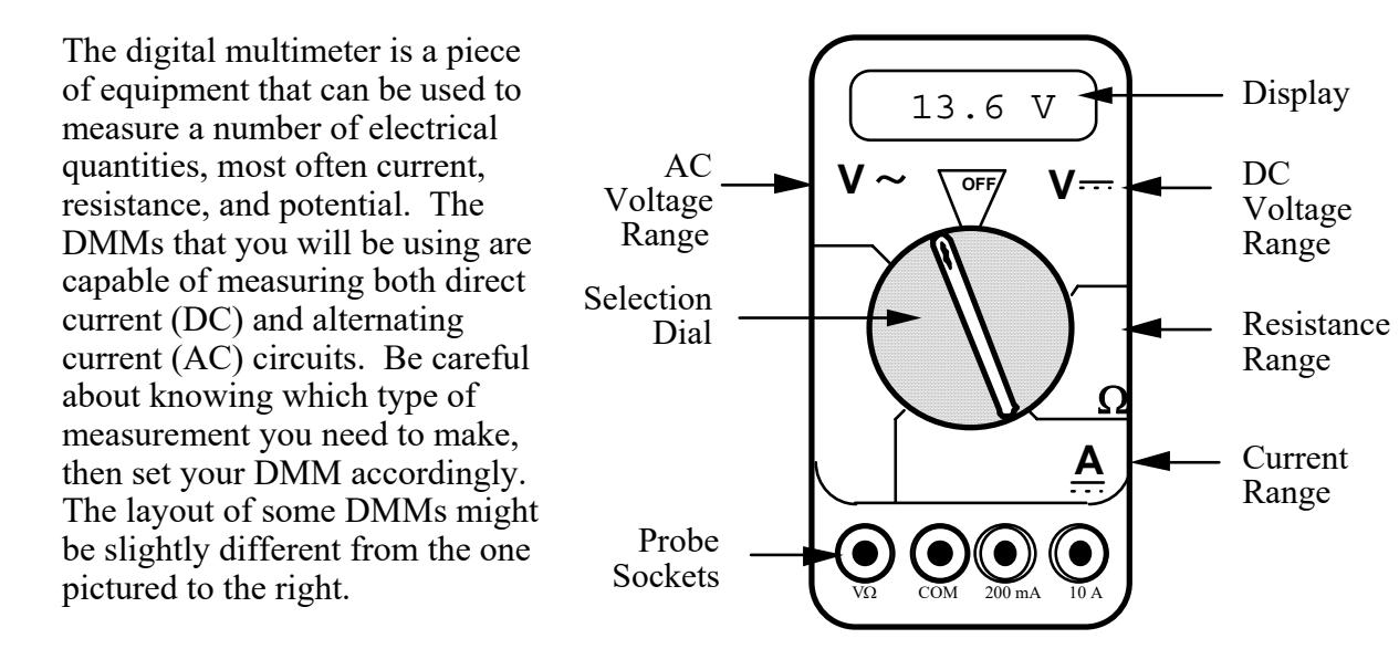 The DMM can measure currents from 10 amps to one microamp (10–6 amps). This versatility makes the DMM fragile, since measuring a large current while the DMM is prepared to measure a small one will certainly harm the DMM. For instance, measuring a 1-ampere current while the DMM is on the 2-milliamp scale will blow a fuse. If this happens, the TA may be able to change the fuse. However, if you damage the DMM beyond repair, you will have to finish the lab without it.